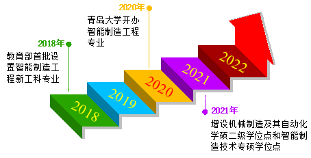 智能制造工程专业是教育部2018年批准设置的新工科专业。2020年,在机械工程专业的基础上,青岛大学智能制造工程专业正式开办,并于2021年开始招收本科生。2021年,在原有机械工程一级学科学术硕士学位授权点下增设了机械制造及其自动化二级学位点,在原有机械专业硕士专业学位授权点下增设了智能制造技术学位点。主要节点如下: