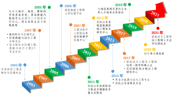 本专业起源于1993年青岛大学纺织工程系的制冷与空调专业。1999年,青岛大学热能与动力工程专业正式开办,后于2013年更名为能源与动力工程专业。下设有制冷与空调工程、热能工程2个专业方向。2006年获批热能工程硕士学位授予权,2013年获批山东省特色专业,2017年获批动力工程及工程热物理一级学科硕士学位授权点,2021年设置动力工程领域工程硕士专业学位授权点,同时本科专业增设新能源与储能专业方向。首届本科生毕业于2003年。本专业现有制冷与空调工程、热能工程和新能源与储能三个本科专业方向。其他重要节点参见下图所示