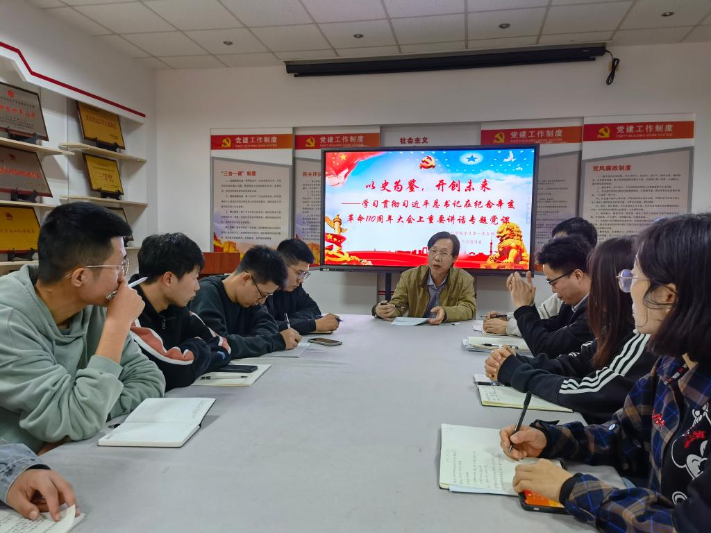 10月30日,我院学生第一党支部在菠菜平台 会议室举行学习习近平总书记在纪念辛亥革命110周年大会上的讲话专题党课,党课由我院学生第一党支部书记孙万超主讲,支部全体党员70余人参加。