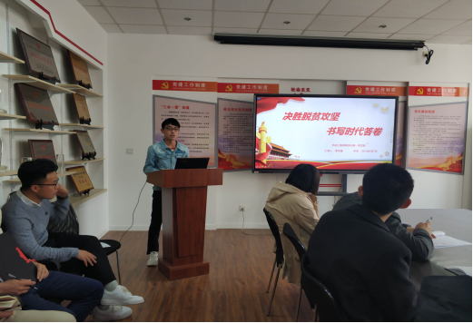 学生党员李永强以“决胜脱贫攻坚,书写时代答卷”为主题,通过数据与今昔对比,展示了中国共产党带领全国各族人民完成了消除绝对贫困的艰巨任务,创造了彪炳史册的人间奇迹。