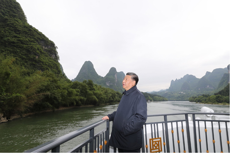 近年来,桂林市大力推进漓江“治乱、治水、治山、治本”,改善了漓江生态环境。25日下午,习近平来到桂林市阳朔县漓江杨堤码头,听取漓江流域综合治理、生态保护等情况汇报,并乘船考察漓江阳朔段。他强调,要坚持山水林田湖草沙系统治理,坚持正确的生态观、发展观,敬畏自然、顺应自然、保护自然,上下同心、齐抓共管,把保持山水生态的原真性和完整性作为一项重要工作,深入推进生态修复和环境污染治理,杜绝滥采乱挖,推动流域生态环境持续改善、生态系统持续优化、整体功能持续提升。