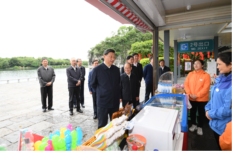 4月25日至27日,中共中央总书记、国家主席、中央军委主席习近平在广西考察。这是25日下午,习近平在桂林市阳朔县,乘船考察漓江阳朔段。新华社记者 申宏 摄