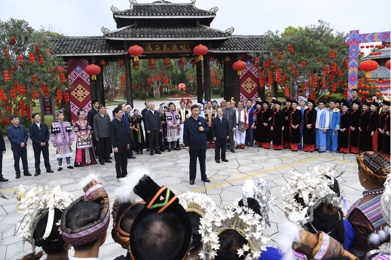 4月25日至27日,中共中央总书记、国家主席、中央军委主席习近平在广西考察。这是27日上午,习近平在南宁市广西民族博物馆外,同参加三月三“歌圩节”民族文化活动的各族群众亲切交流。新华社记者 鞠鹏 摄