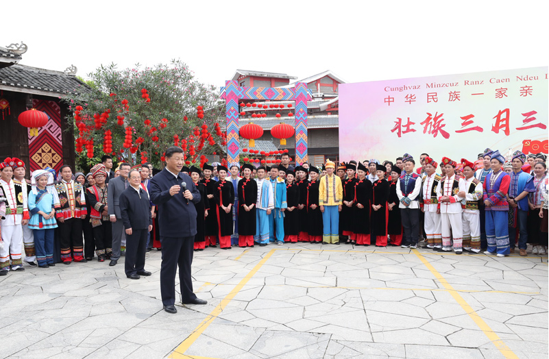 广西是我国少数民族人口最多的自治区。27日上午,习近平来到位于南宁市邕江之畔的广西民族博物馆,参观壮族文化展。博物馆外,三月三“歌圩节”壮族对歌等民族文化活动正在这里集中展示。习近平强调,广西是全国民族团结进步示范区,要继续发挥好示范带动作用。各民族共同团结进步、共同繁荣发展是中华民族的生命所在、力量所在、希望所在,在全面建设社会主义现代化国家的新征程上,一个民族都不能少,各族人民要心手相牵、团结奋进,共创中华民族的美好未来,共享民族复兴的伟大荣光。