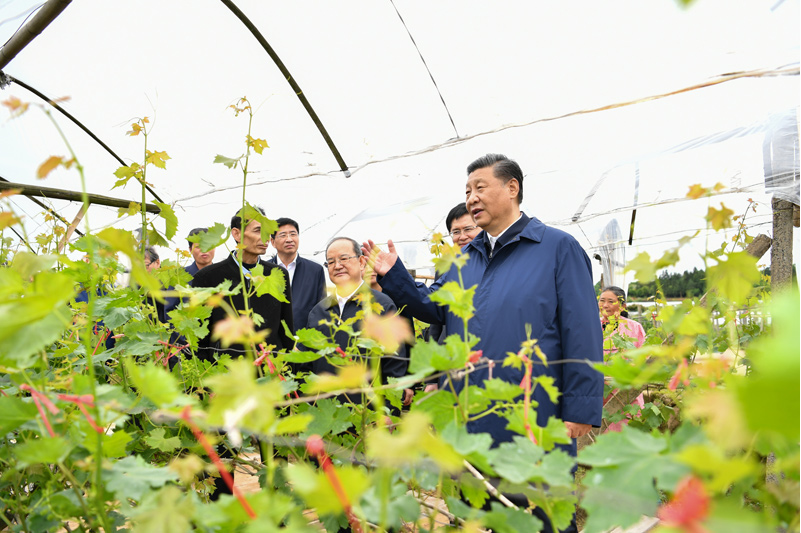 4月25日至27日,中共中央总书记、国家主席、中央军委主席习近平在广西考察。这是25日上午,习近平在桂林市全州县才湾镇毛竹山村,走进葡萄种植园,同农技人员和村民亲切交流。新华社记者 殷博古 摄
