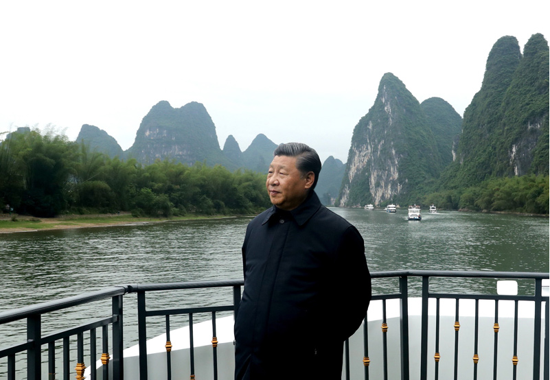 4月25日至27日,中共中央总书记、国家主席、中央军委主席习近平在广西考察。这是25日下午,习近平在桂林市阳朔县,乘船考察漓江阳朔段。新华社记者 鞠鹏 摄