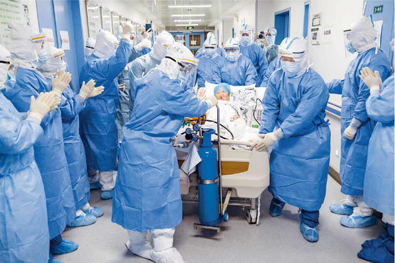 在此次抗疫斗争中,全国广大医务工作者不忘初心、牢记使命,响应党的号召,义无反顾冲上疫情防控第一线,同时间赛跑,与病魔较量,顽强拼搏、日夜奋战,展现了对党、对人民高度负责的精神面貌,生动诠释了伟大的中华民族精神。图为2020年4月12日,北京协和医院医疗队队员与武汉同济医院医务人员共同将病区最后一名新冠肺炎危重症患者转往武汉同济医院中法新城院区ICU。 新华社记者 沈伯韩/摄